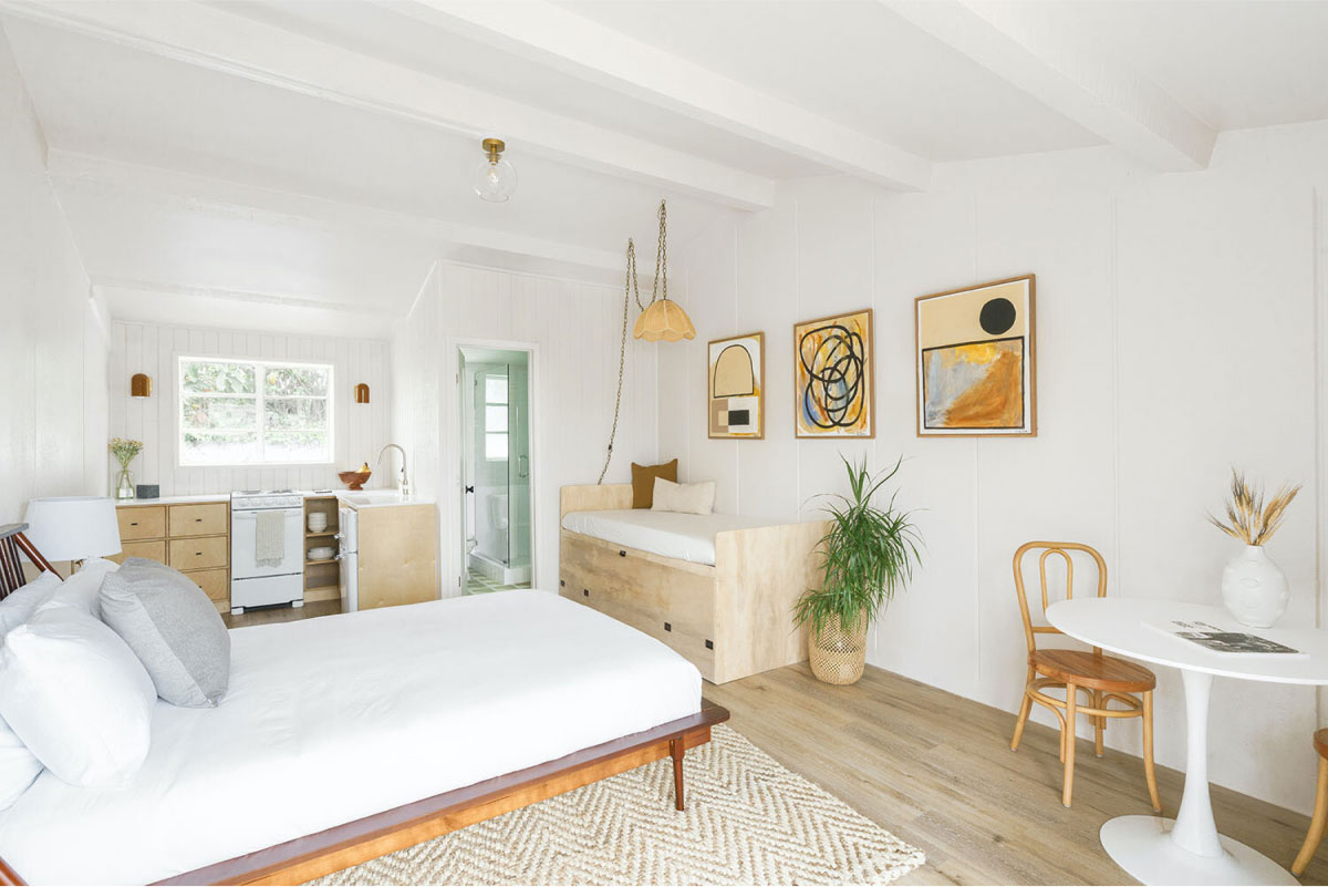 Come for the primo South O location, stay for the design vibes. Find individually curated rooms that nod to the surf and sound subcultures of SoCal in this boutique hotel with designer studios and one- and two-bedroom suites—perfect for groups—with kitchenettes, uniquely appointed with bohemian accents and plush interiors. Formerly a 1950s era motel, The Green Room received a loving makeover from two former guests who used it as their homebase when hitting the surf breaks in O’side and nearby Carlsbad. Rooms feature custom art from local artists, midcentury modern furnishings, unique Moroccan rugs, and even private patios.