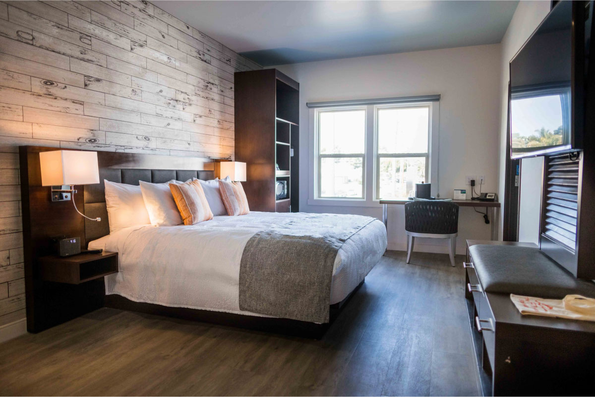 Part of the Tapestry Collection by Hilton, The Fin is a design-forward experience just four blocks from the beach. The building dates to the 1920s, but the boutique hotel’s chic style is utterly of the moment, with elegant and tasteful touches that make every guest a VIP. Find spacious king bed rooms and luxurious queens, with 300 thread-count sheets and 50” HDTVs for private lounging. Per diem rates for government and military are offered based on availability.